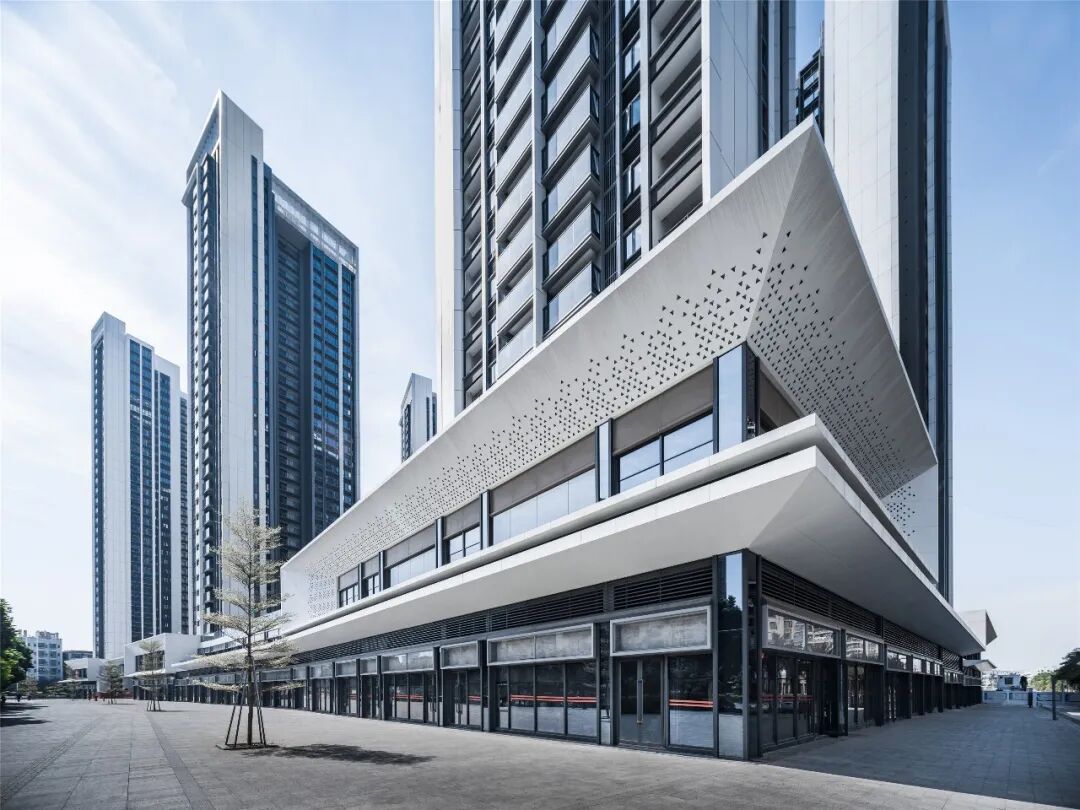 设计师采取纯粹、干净的立面处理手法,使用米白色折面穿孔铝板造型彰显塔楼顶部的简洁方正,辅以精致的细节设计,通过门头、屋顶、墙身、阳台、线脚等精细化设计,严控立面节点,提升建筑的精气神。