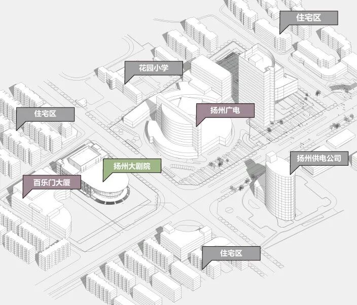 扬州大剧院的升级改造旨在创造多变、灵活、通用的观赏和互动的艺术空间。在周围用地上,建筑风格各异,如何在这个多元环境中塑造个性鲜明的建筑形象、完美的建筑功能成为本案设计所要面对的挑战。