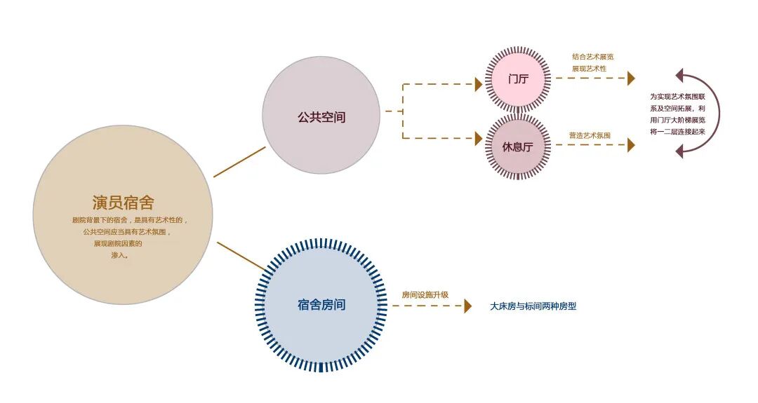 秉承打造一个文化艺术综合体的的设计愿景,改造计划将充分利用已有的剧院观众席、舞台及酒店房间等核心功能元素,保留剧院的基本结构。我们对建筑的功能布局、内部空间以及外部形态等多方面进行升级,在接下来的内容中,从四个层面对此次改造展开阐述。