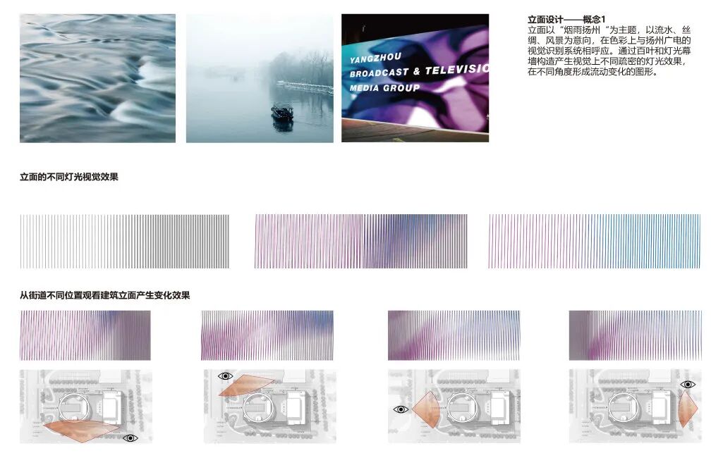 在立面方案中,方案一以“烟雨扬州”为主题,汲取了流水、丝绸和风景的灵感,色彩呼应扬州广电的视觉识别系统。透过百叶和灯光幕墙的精妙构造,产生视觉上疏密不一的灯光效果,在不同角度呈现流动变化的图形。这样的设计不仅使其成为扬州文化的代表,更将其打造成为城市文化的亮点,以开放的姿态与市民互动。