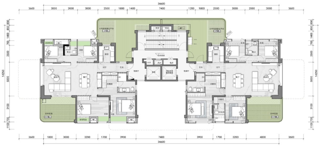 项目设计把空中花园转译为两层高、奇偶层错位设置的大进深阳台。空中花园:每套的私属花园,从户内进入。空中园林街巷:每层的公共花园,从核心筒进入。