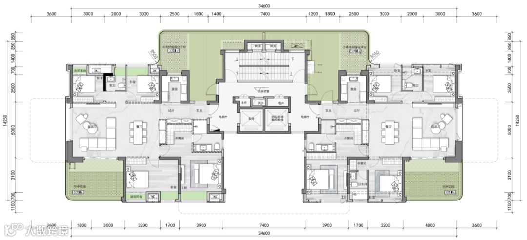 公共休闲绿化平台 ——内凹式巧妙设置公共休闲绿化平台,与户内空间完全脱开,既不会对户内造成遮挡,又与核心筒公区直接连接。超乎想象的户外空间面积,令其功能和场景更为多元化,真正实现生态住宅的花园生活。