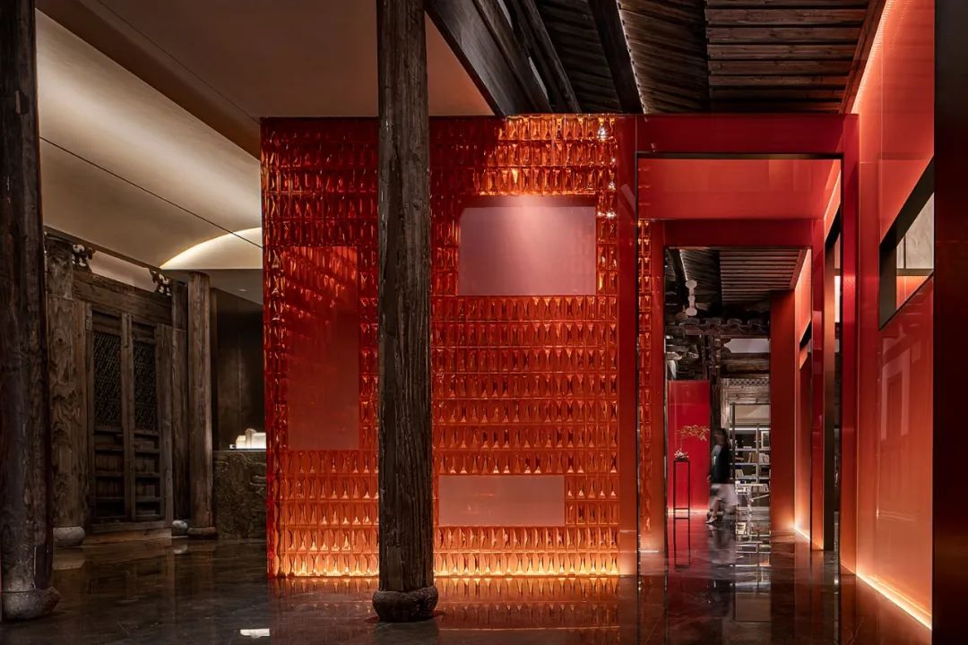 56号前厅采用红色亚克力砖搭建空间,砖上的抽象切面造型代表了“落叶归根”的传统思想文化,以欢迎南洋华侨回乡后更多地参与到福州的城市建设中来。