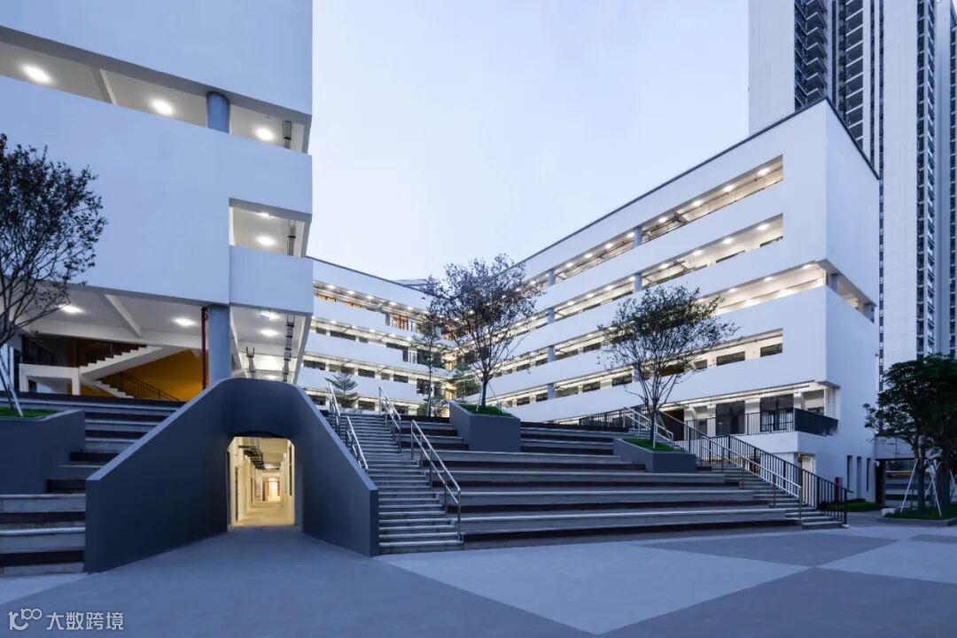 小学部普通教室外侧设置宽大的架空活动平台,结合连续的开场楼梯,创造多层次活动空间,满足小学生奔跑游戏、文娱展示的课外需求,打造活跃的“第二”教学空间。