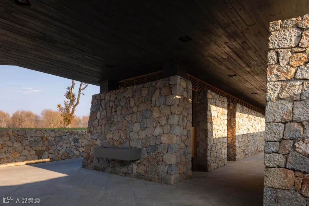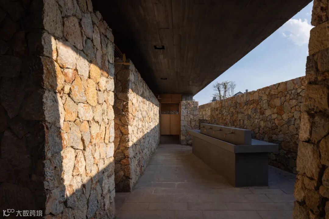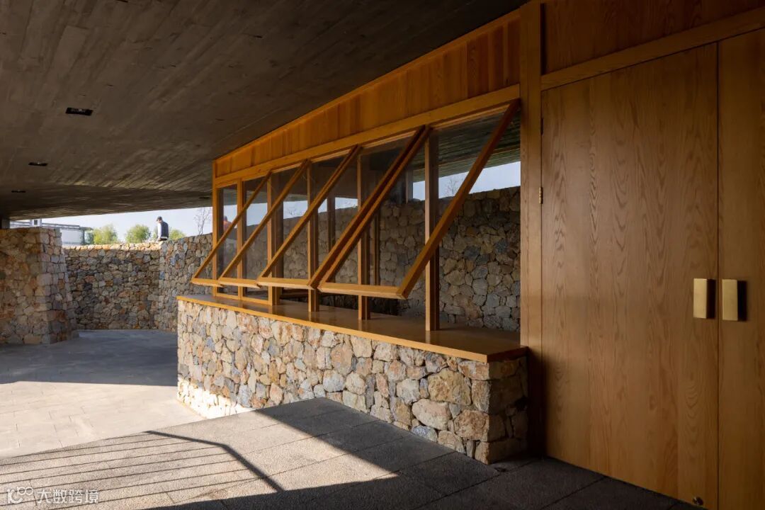 气候影响是设计的另一重要考虑。由于当地风能和光照资源充沛,除了建筑要求的卫生间、小卖部等功能面积外,我们尽可能地将折板屋面下的空间从封闭中释放出来,包括毛石墙基座与混凝土折板的脱离处理,形成完全的空气对流和风景导入,使得内外环境自由渗透、具有呼吸感。