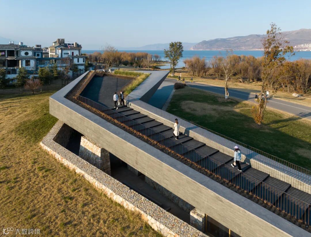 在避让树木、连接道路和背靠苍山、面朝洱海的双重指向性下,建筑自南向北发展,逐渐起坡,仿佛由大地的一道“裂缝”生长而来,在连续起伏变化的地形中掀起一处登高望远的平台和一处可短暂停留的遮蔽,借此重新唤起自古人与自然相依的经验。