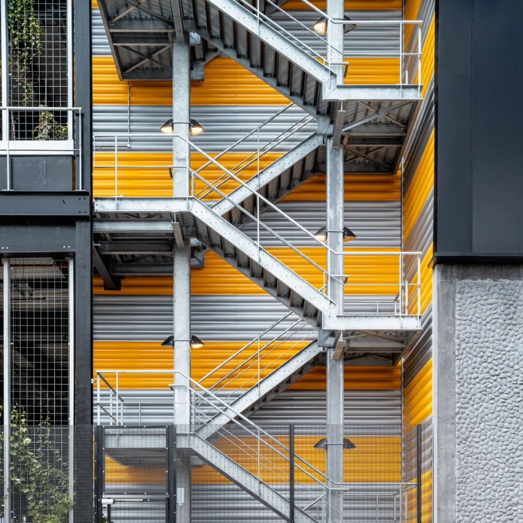 The scheme has employee well-being and community at its core. Amenities include a ground-floor café with a business hub, breakout spaces, cycle parking, and changing and shower facilities. Industria is also well served by public transport, including rail and buses, and provides EV charging points. Haworth Tompkins worked with the branding agency DNCO to design graphically bold elevations that reflect the building’s industrial function, as well as the scheme’s wayfinding and graphic identity. The corrugated metal paneling of the interior deck façades features a playful silver and yellow checkerboard pattern, inspired by the building’s helical vehicle ramp logo.
