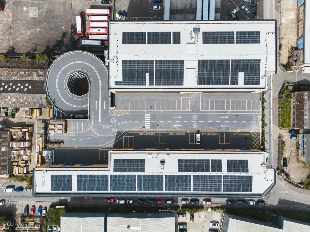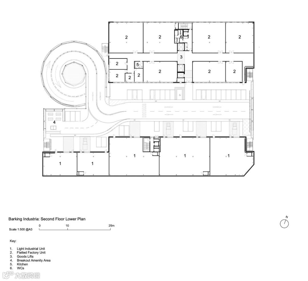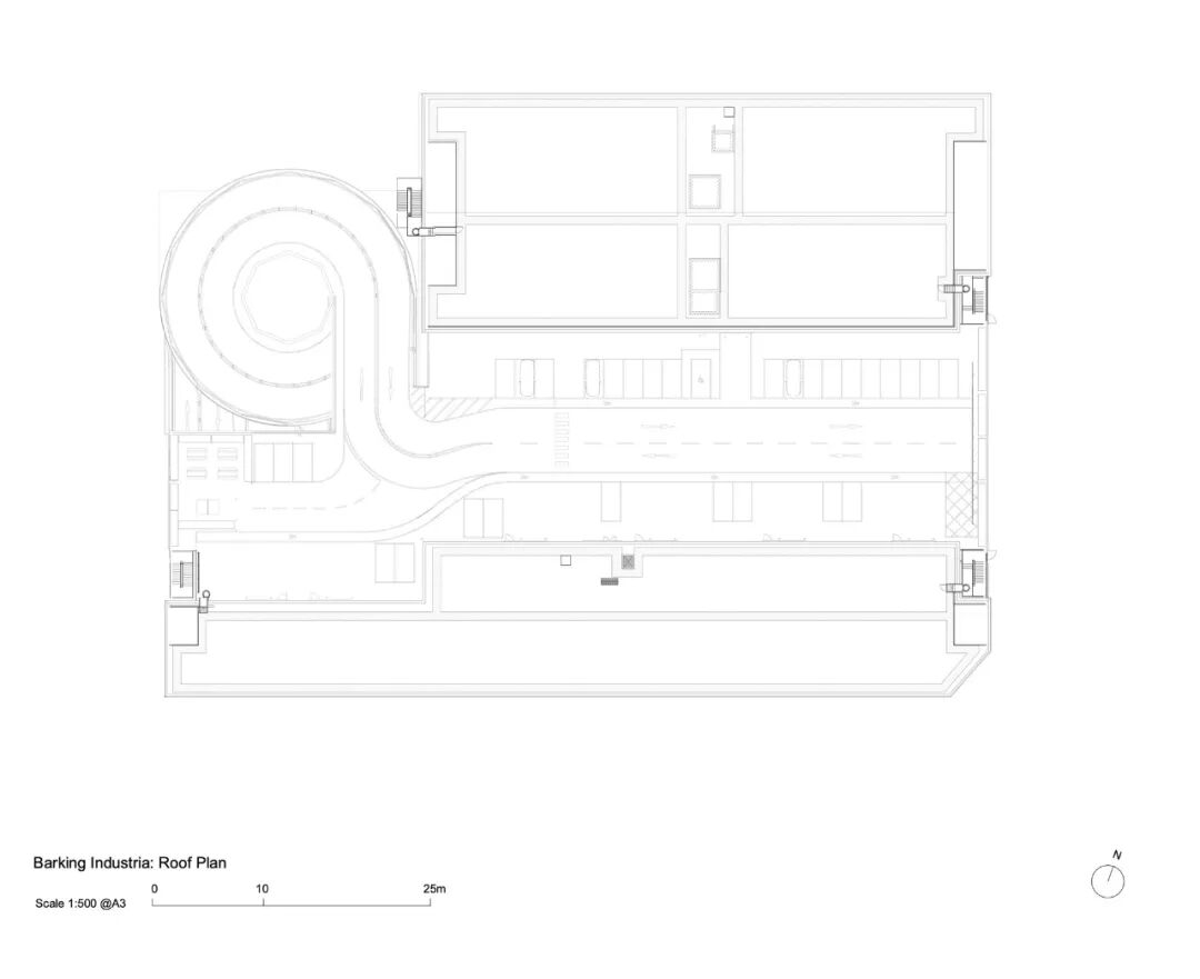 该建筑有两个线性翼楼,分别位于三层 26 米宽的服务平台两侧,可通过直径 30 米的螺旋坡道进入,提供直接的车辆通道。每个7 米高的单元都有自然采光和通风,并可容纳夹层,以实现定制布局。其中一翼还有一个额外的楼层,为规模较小的租户、初创企业和孵化器单位提供空间。Industria 是与工业专家 Ashton Smith Associates 合作设计的。