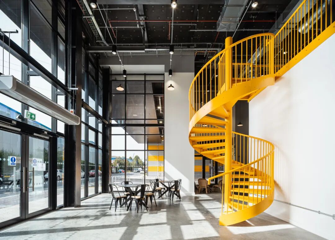 The building features two linear wings arranged on either side of three levels of 26m-wide service decks, accessed by a 30m diameter helical ramp, providing direct vehicle access. Each 7m high unit features natural light and ventilation and can accommodate mezzanine levels to create bespoke layouts. One wing has an extra floor, providing spaces for smaller-scale tenants, start-ups and incubator units. Industria was designed in collaboration with industrial specialist Ashton Smith Associates.