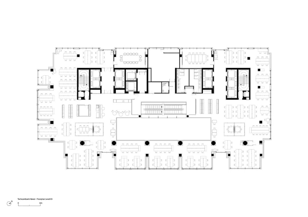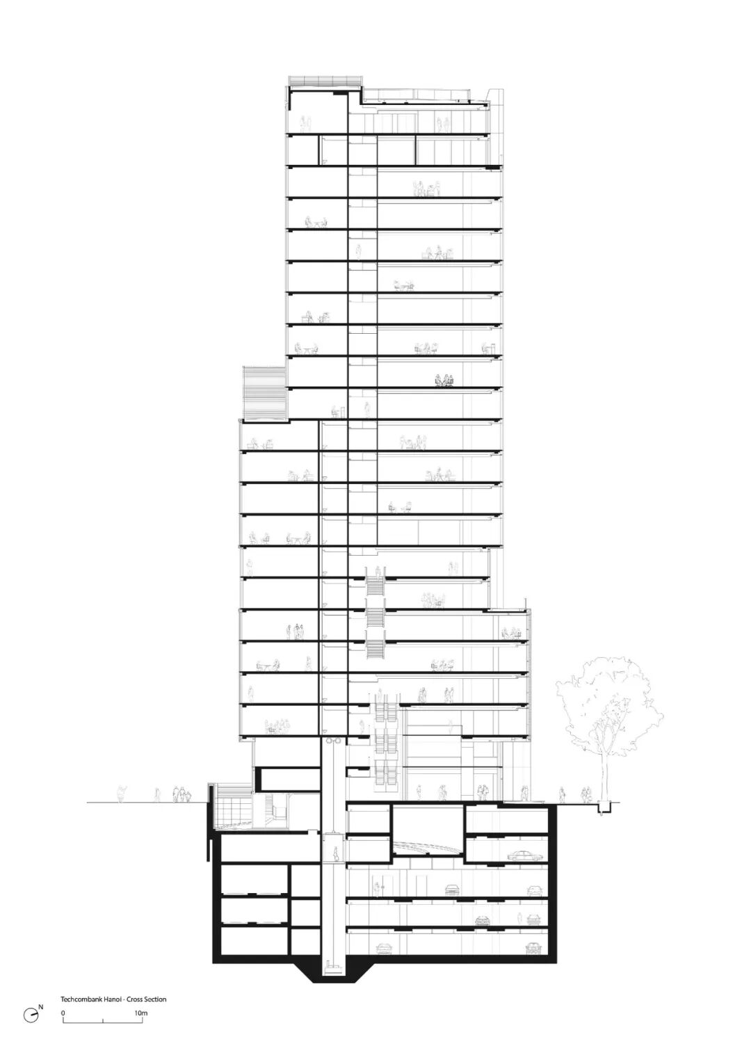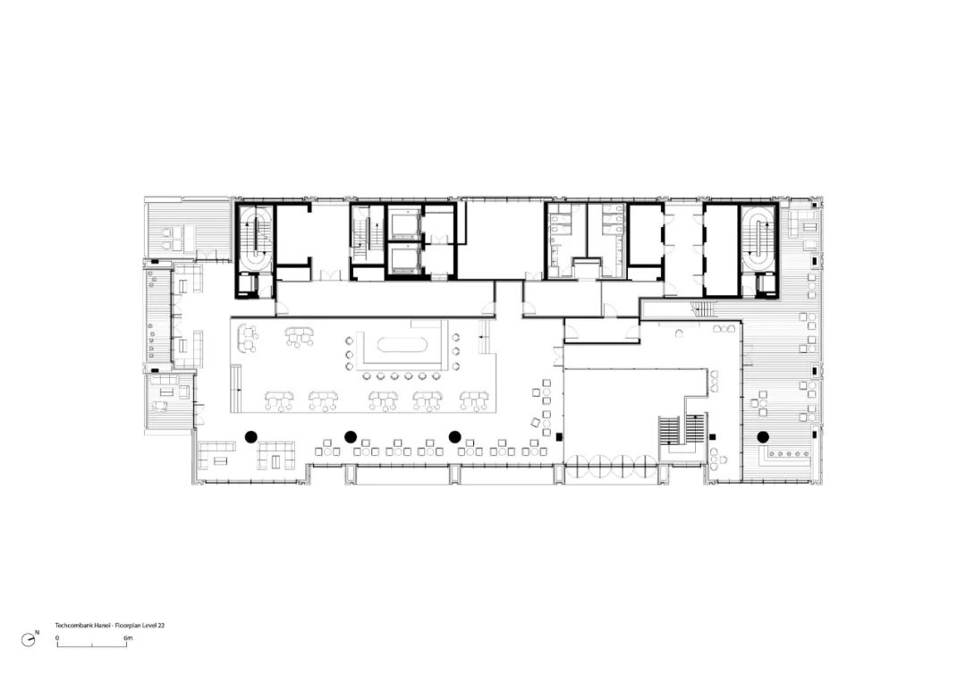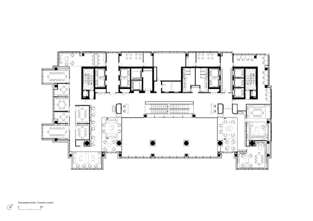 The public-facing departments and banking activities are grouped together and located at the base of the building for ease of access, while the senior management and other internal departments are positioned on the floors above. Level 7 features amenity spaces – for employees and the public – where people can eat and socialize together. A bar and an outdoor terrace across the top two floors offer spectacular views of the Hanoi skyline and Hoan Kiem Lake.