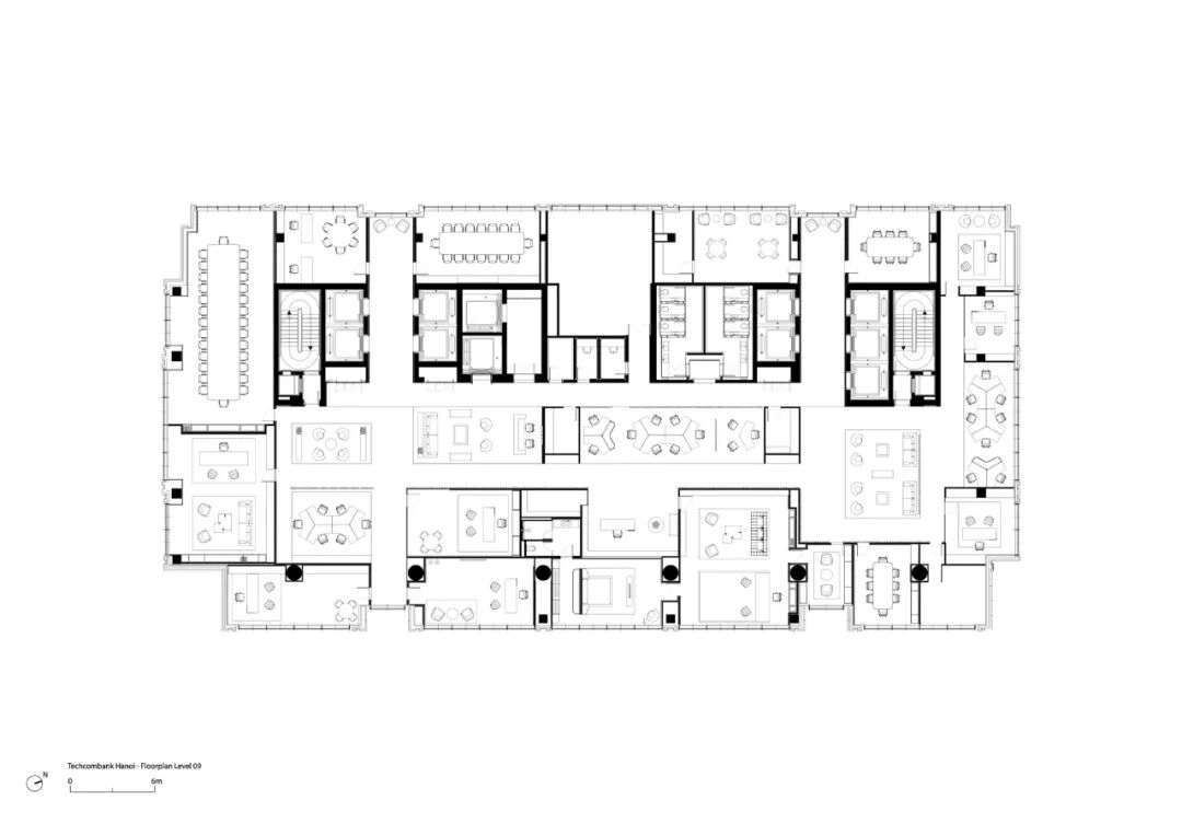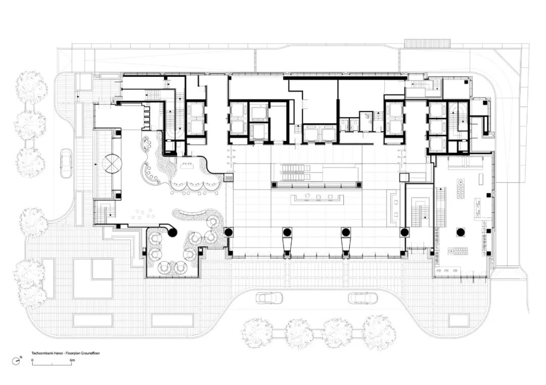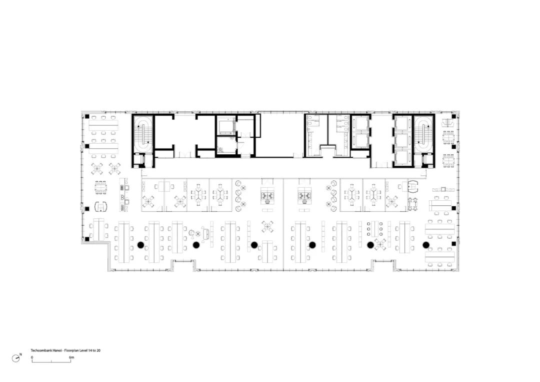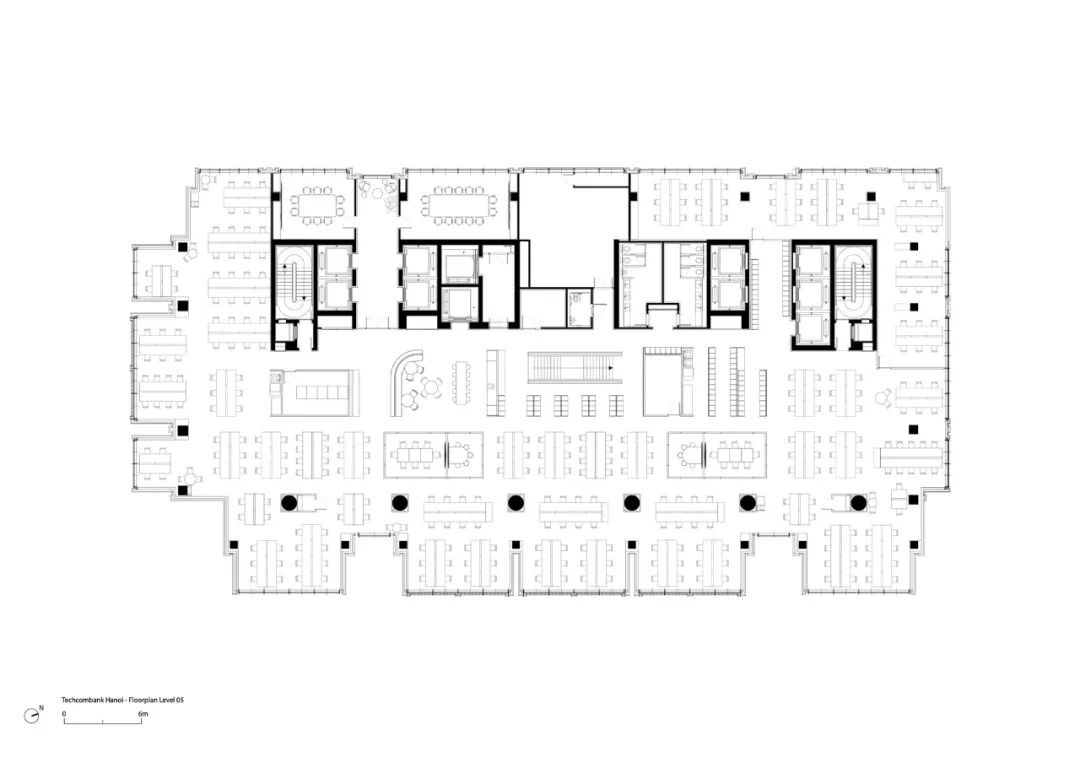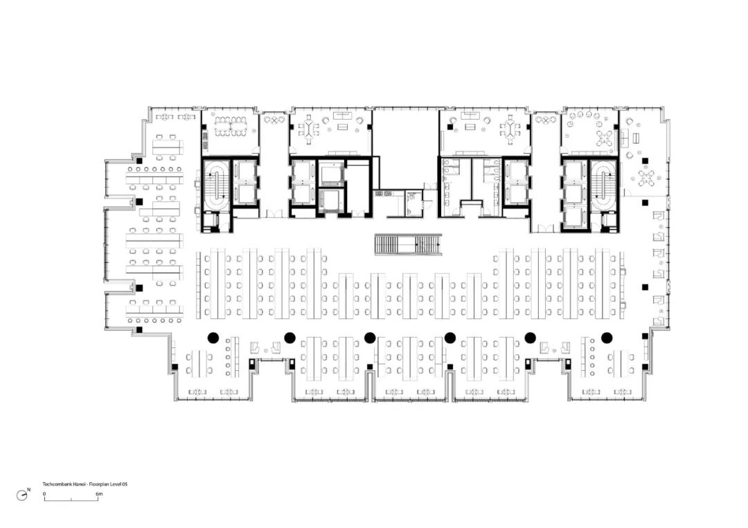 The public-facing departments and banking activities are grouped together and located at the base of the building for ease of access, while the senior management and other internal departments are positioned on the floors above. Level 7 features amenity spaces – for employees and the public – where people can eat and socialize together. A bar and an outdoor terrace across the top two floors offer spectacular views of the Hanoi skyline and Hoan Kiem Lake.