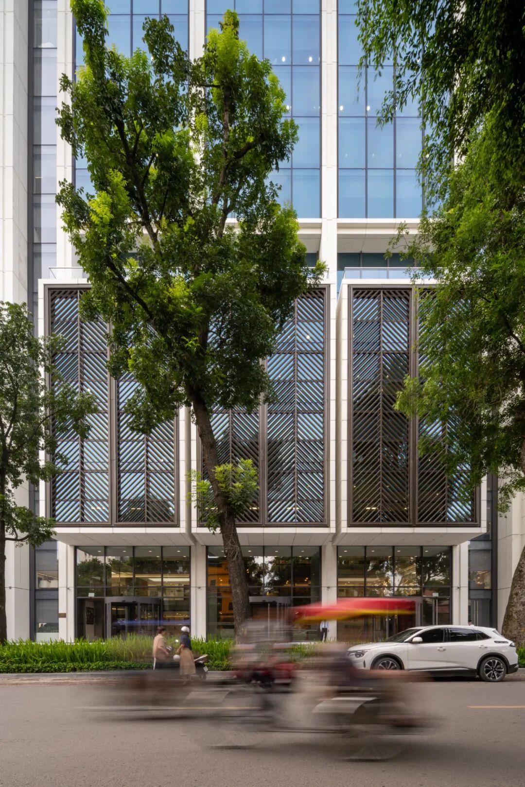 The project learns from the urban grain of the city. The base of the building is designed at a human scale, reflecting its public nature. It is clad with rich, earthy materials and screens, which respond to nearby buildings in the old quarter of Hanoi. On the upper levels, the predominantly glazed façade frames panoramic views of the city.
