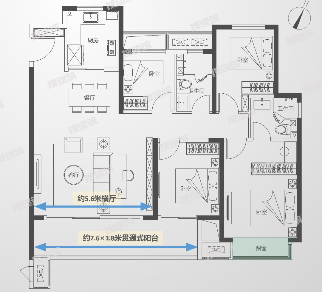 建筑面积约143㎡户型,4房2厅2卫,全明四房设计,享约5.6米大横厅,南向四开间通透敞亮,约7.6米×1.8米贯通双联式阳台。