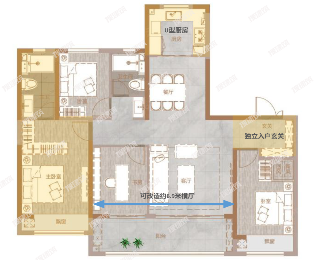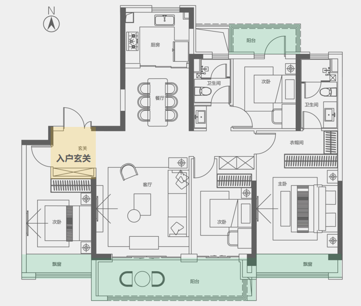 建筑面积约149㎡户型,做到了四面宽朝南设计,入户超大玄关,南北双大阳台和南向卧室飘窗设计,通透性与采光更佳。