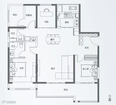 南向两个卧室,一个是主卧一个是老人卧,北向的两个卧室,可以分别住孩子,也一定程度上保证了孩子的独立成长空间。