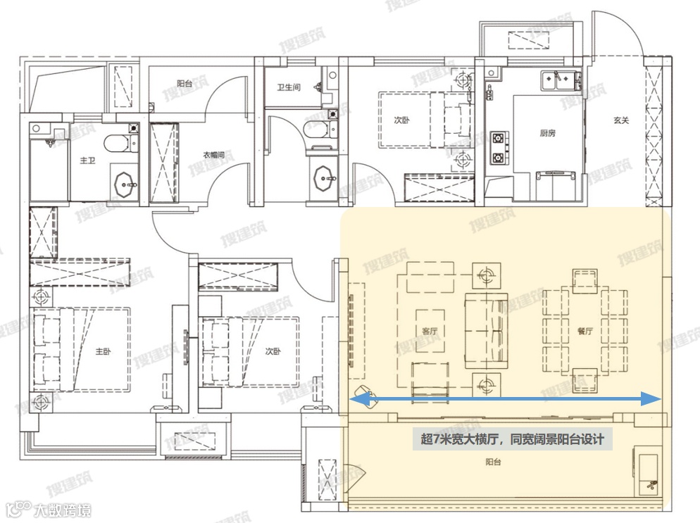 约6.9米宽厅自带多功能空间,超大采光面,自由完成派对、家宴、游戏、影音等多维场景翻转,亦可以收获家庭情感的共鸣与升华。