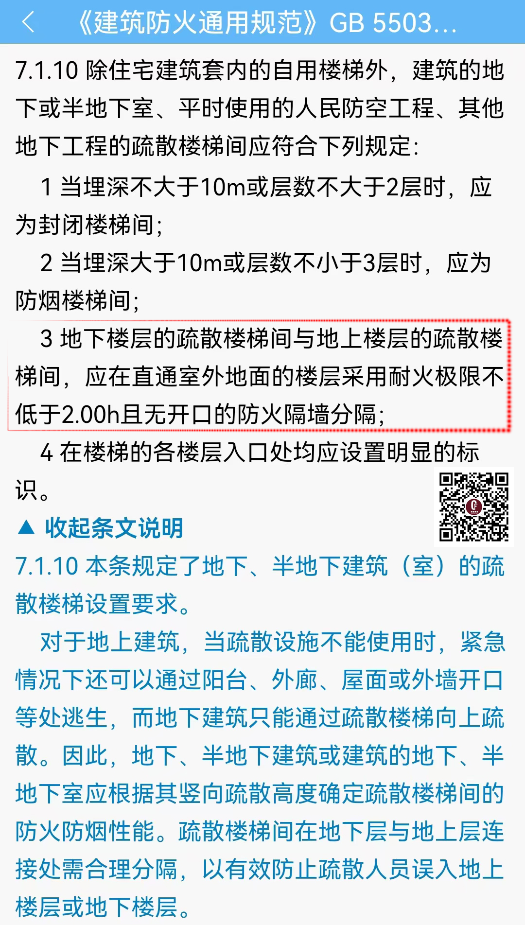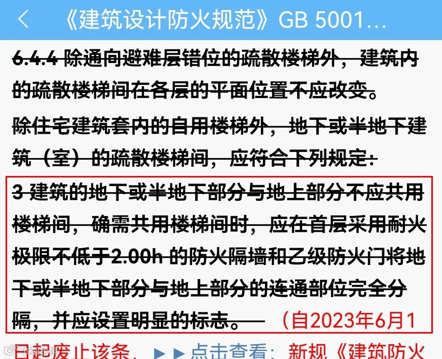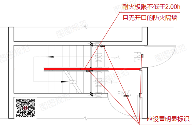 图图规范认为,这种理解是将“地下、地上楼梯分隔”的理解扩大化了,是有偏差的,这是没有理解新规背后的目的,条文说明中目的表达得很明确了:是为了有效防止疏散人员误入地上楼层或地下楼层,而不是为了直通室外。