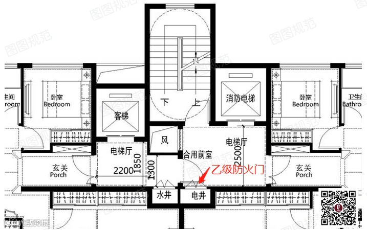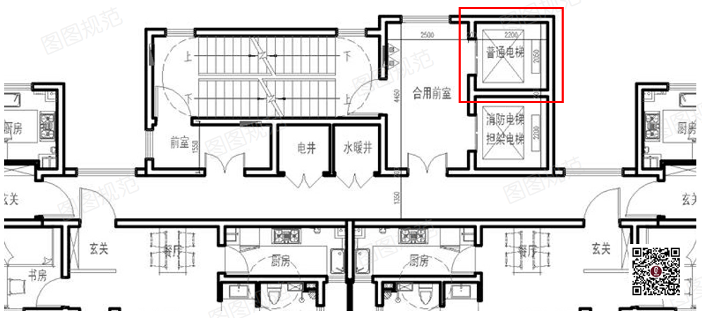 在6.4.3条文解释中,虽然说明住宅前室可以设置管井,但没有提及是否可以设置普通电梯。虽然规范没有明确前室是否可以设置普通电梯但实际案例中是大量存在的。
