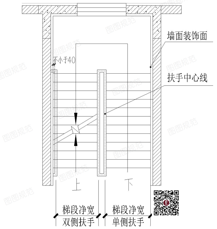 2) 当疏散楼梯有一侧为墙体、另一侧为扶手或栏杆时,应为完成墙面到栏杆或扶手内侧的最小水平净距。