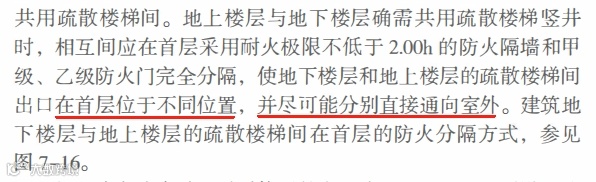 在《〈建筑防火通用规范〉实施指南》中也是提到,地上、地下楼梯出口在首层位置不同,尽可能分别直接通向室外,而并非强制规定必须分别直通室外,即并非禁止不允许地下楼梯出口借用首层门厅通至室外。