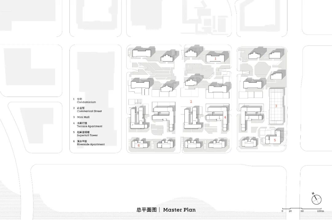 小高层建筑采用双向退台的手法,营造出灵活、多样化的体量关系,也使居住者的景观视野实现最大化;L型、F型的楼栋围合出尺度适宜的院落,满足人们对阳光与活动的需求。耸立其后的高层住宅遵从北高南低的布局原则,以楼栋的体量变化、位置错动,构成起伏的天际线;立面则以“不对称均衡”的手法营造自由、流动的感受。
