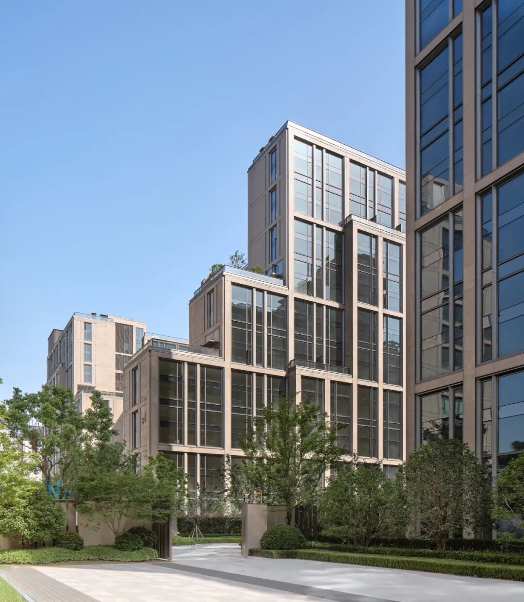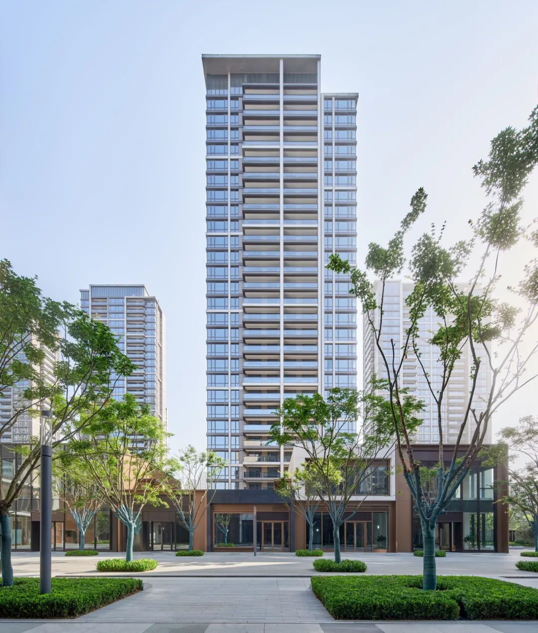 建筑的材料及细部亦延续了对于杭州城市气质的思考,展现传统与现代交织的意境。小高层建筑立面采用浅色玻璃与中性灰石材为主要材料,点缀以深色金属,凸显“典雅而温润”之美。尺度瘦高的玻璃窗将通透的外部景观引入室内;建筑顶部浅灰色穿孔金属板铺陈的竖向线条强化建筑的挺拔感。