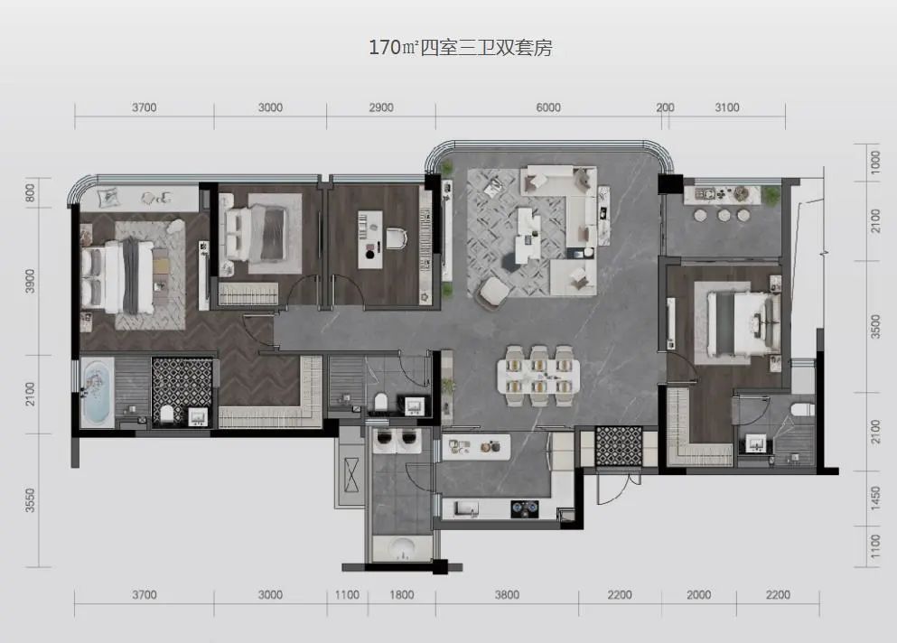 主力奢尚大平层,坐拥城市天际线;在尺度感官基础上,深度考量居住体验,实现客厅和主卧、次卧均能够有很好的采光。