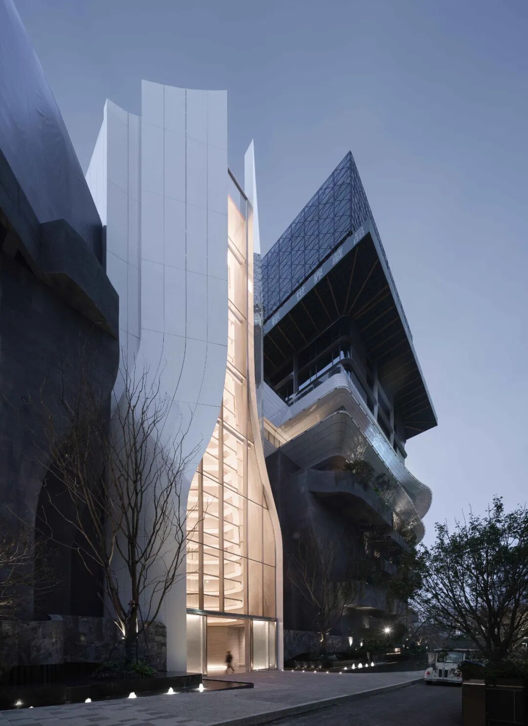 设计团队将重庆连绵起伏的山形地貌,抽象为波浪折线立面,产生跌宕起伏的立体感,构建出了流动在建筑上的现代山水。