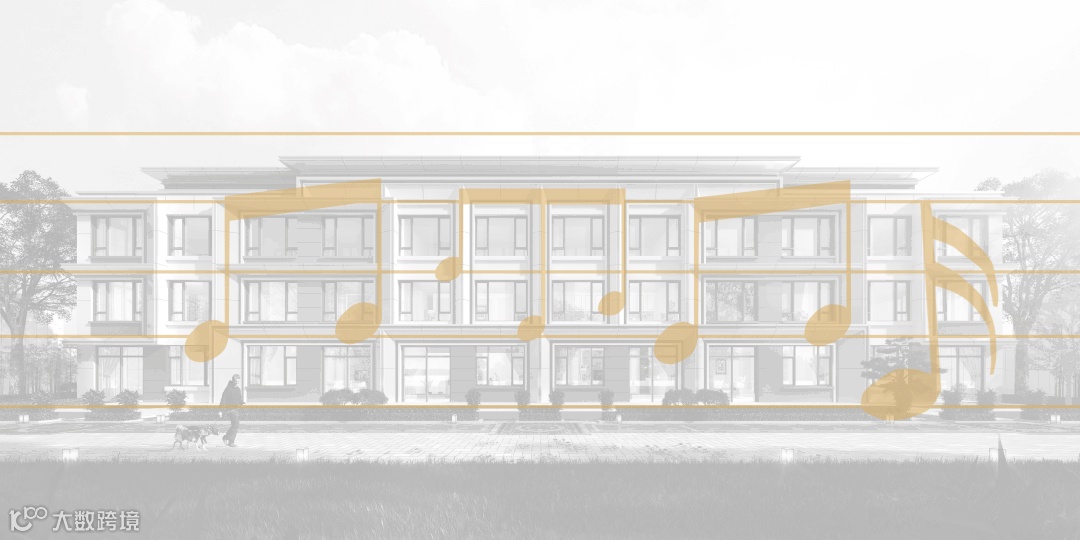 建筑为管,自然为弦,秉持着演绎人与自然共居的理想,化为黑白琴键意喻的古典音乐韵律,彰显“新古典主义”的设计美学。视觉中心为竖向线条,强调建筑形体的挺拔、向上的姿态,两边以横向线条为主,强调视觉横向的延伸。