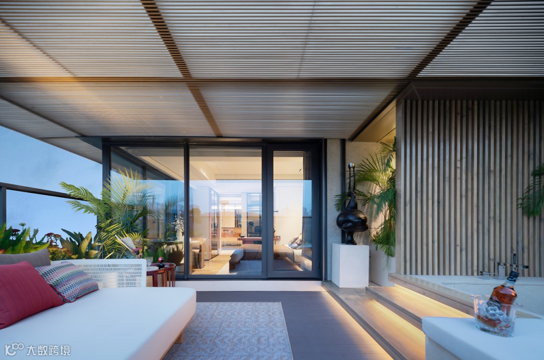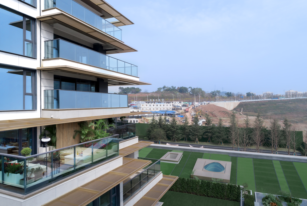 项目通过创新错层阳台布局,打造了一个约6米双层挑空、270°观景“云端私宅”,把本属于地面的院落,移到了空中,构一方“空中庭院”,让人真正拥抱天空。