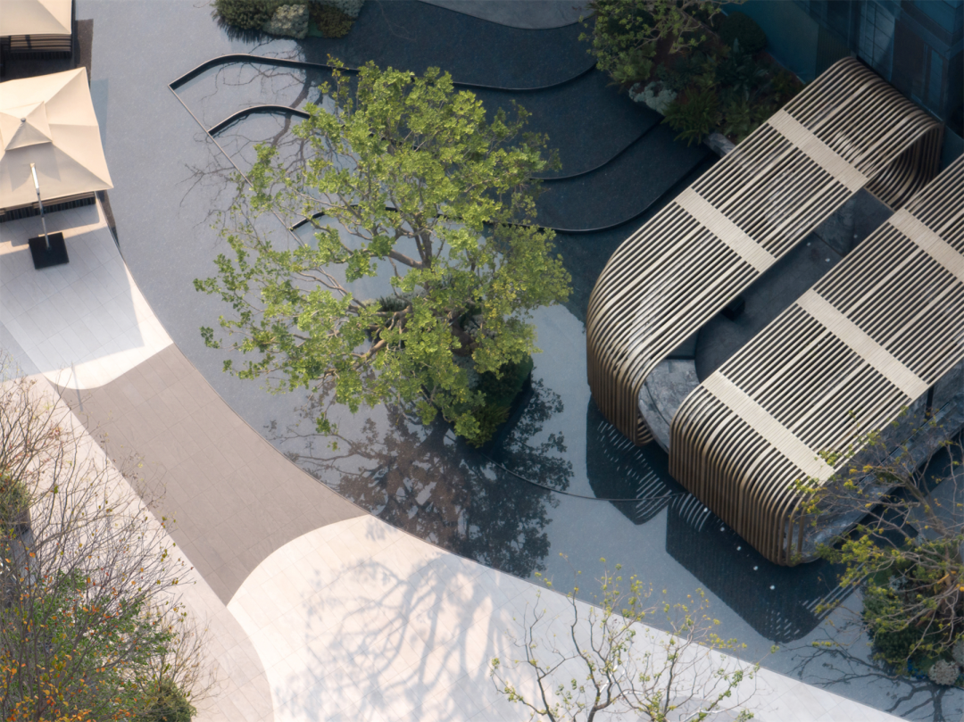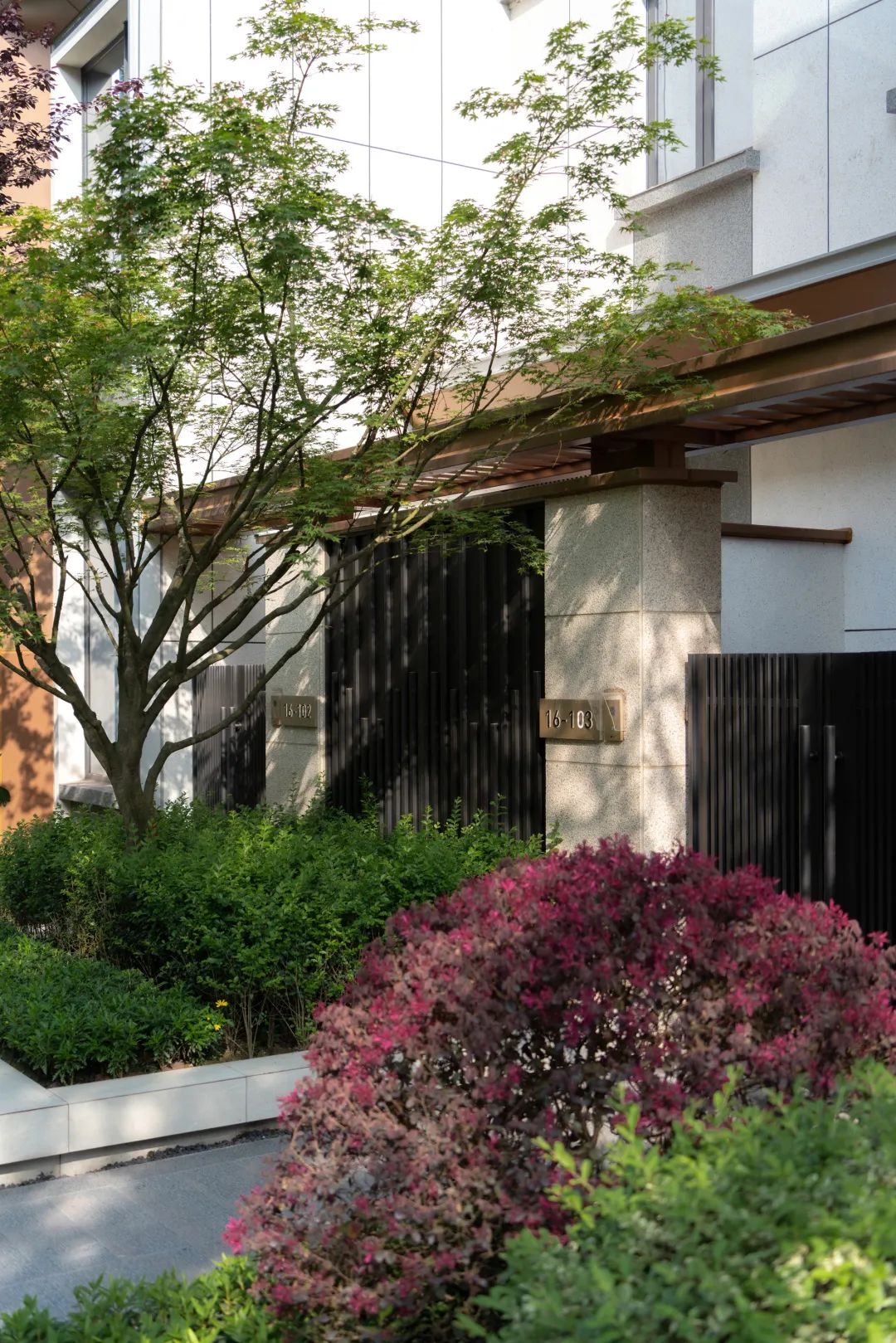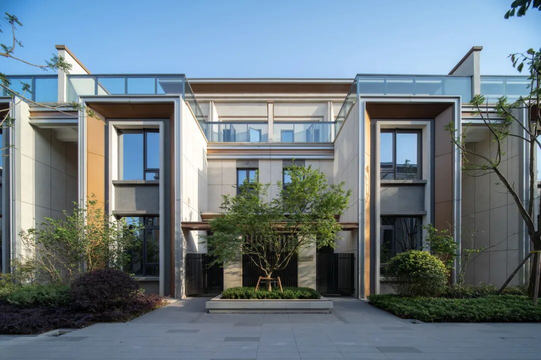 独栋别墅自带小院落,树影斑驳间的入户路线设计,强化了归家的仪式感,外围门户简约而典雅,铺陈了独门独院的仪式与私隐,同时不影响建筑立面的整体效果。