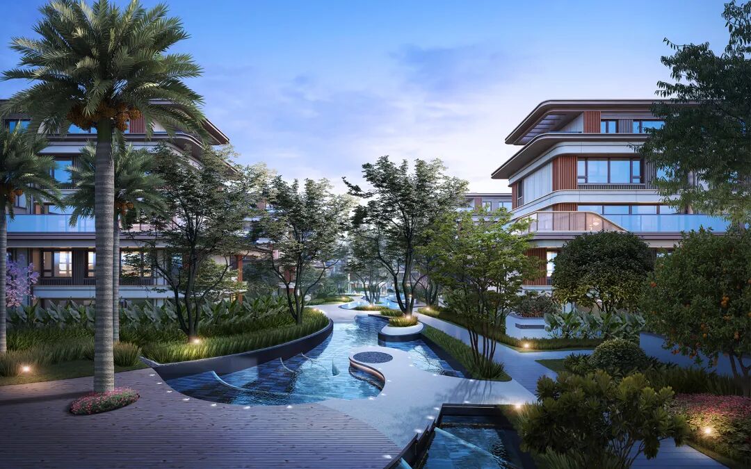 社区内以‘蔓生活’为主题的度假式风情园林,形态各异的乌桕林、植被环绕的棕榈岛、香槟金色调的铝板搭配玻璃幕墙以及潺潺的水景。项目以国际度假酒店为灵感,运用 “宝格丽蓝”迎宾屏、星级酒店式社区大堂、蔓藤纹镂空铝板、幻境星空顶等元素,营造出度假生活的尊崇感。