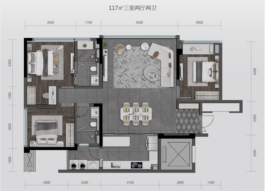 在建面只有99平米的三房户型中,非常少见。并且得房率更是达到了夸张的约89%。