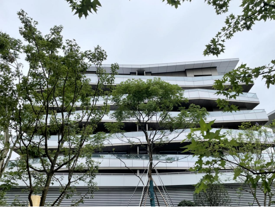 白色的立面象征重庆的薄雾漂浮;80%的金属铝板材质,配上玻璃栏板;铝单板、铝格栅、铝灰挡板、旭格门窗系统