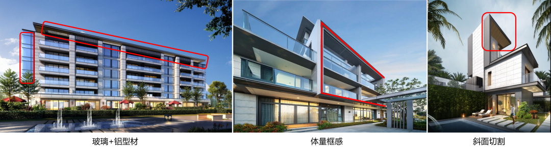 立面摄取了现代建筑立面常用的处理手法,提取体量框感和斜面切割,材质选用铝板和玻璃等极具现代风格的建筑材料,使整个立面造型简洁流畅,富有现代建筑的锐利和精致感。