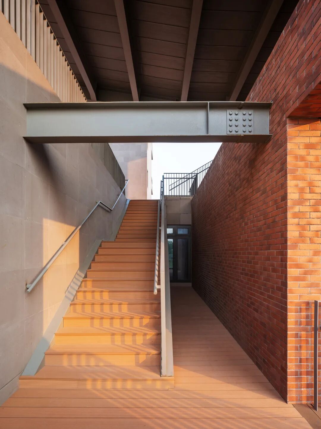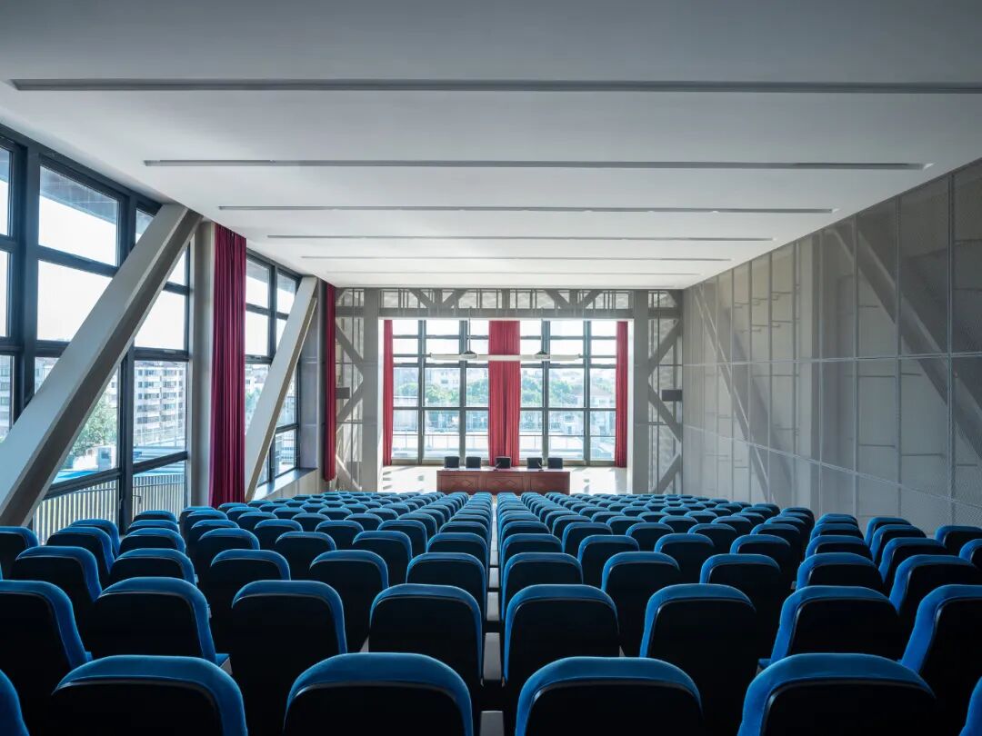 The fundamental ethos of the entire architecture departs from the harmonious coexistence of individual components and the collective entity, where independence is coupled with interdependence, which also serves as the starting point of the structural system design. The grand steel-structured lecture hall delicately rests upon the apex of the library, its expansive glass facade facing the sports ground vista. The smooth fusion between the library's rooftop and the lecture hall represents the pinnacle of technical challenges within the project - to open up the entire internal space, the design employed bridge-building techniques to construct the lecture hall. Leveraging the apex of the library, the lecture hall gracefully ascends in the rear akin to a dancer poised on tiptoe, overlooking the students exercising on the playground.