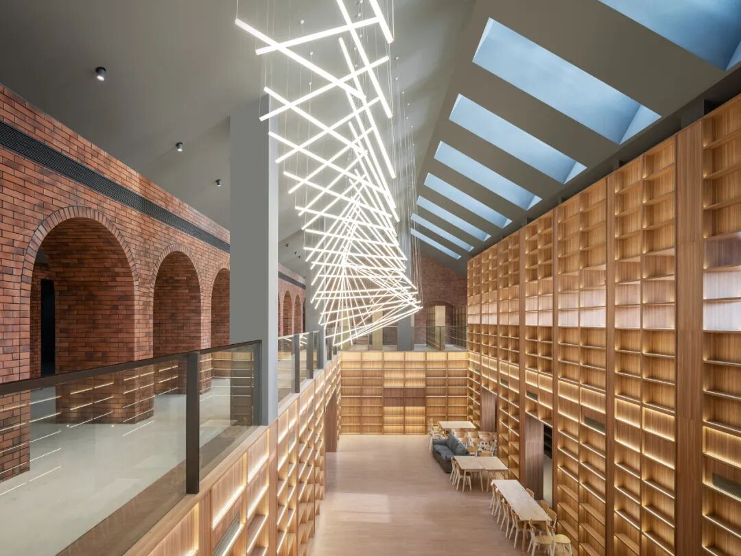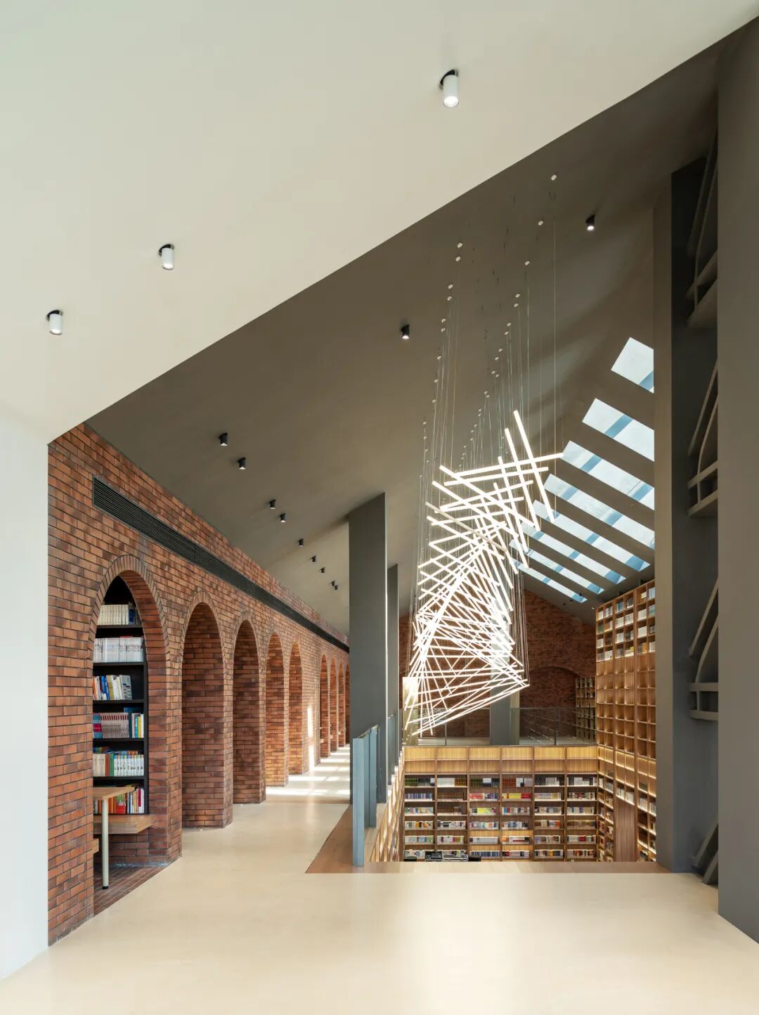 NODE is also in charge of the interior design of the Comprehensive Building. Tailored to the distinctive character of each space, a palette of materials bearing diverse "emotions", such as patterned tiles, wooden veneers, and exposed concrete wall finishes, are compiled into a collage that gives each space its own unique "expression", allowing occupants to freely shift their moods during different hours and thus profoundly enriching their personal engagement with the space. Within the atrium void of the library, the designer incorporates a luminous installation comprising triangular configurations fashioned out of light strips. Detached along their sides, the light strips orchestrate a sequence of rotations and gradients, engendering a dynamic three-dimensional structure within the spatial expanse, which both accentuates the height and depth of the space and establishes a visual focal point as well.
