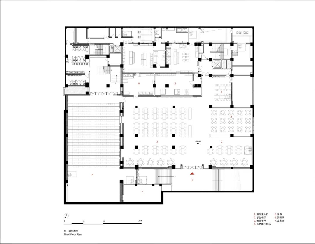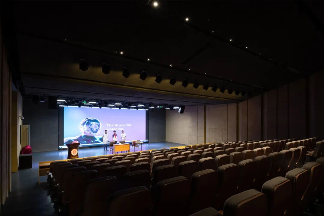 Situated within the basement level of the Comprehensive Building, the theater features two entrances with direct access to the outside that dispels any negative perceptions typically associated with underground spaces, while the configuration substantially facilitates evacuation efficiency. A spacious underground passage connects the cafeteria with the eastern entrance of the theater, providing the cafeteria with ample natural daylight. The interior of the cafeteria is indulged with ample brightness and openness, adorned with a refreshing minimalist aesthetic with a touch of yellow to add some character to the space.