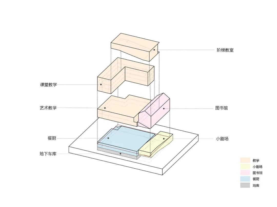 Following its transformation, the Nanqiao Academy Comprehensive Building forms an amalgamation of school and communal functions. By employing a methodology resonant with the interlocking "toy blocks," the structure weaves together various prototype spaces including the library, lecture hall, theater, cafeteria, laboratories, art studios, and music chambers, which were once scattered across disparate locations on the original site. These spaces are collaged and stacked into a cohesive "spatial puzzle cube", giving rise to an array of captivating and innovative places. This arrangement fosters a distinctive spatial experience that remarkably stimulates the students' thirst for imagination and exploration. In this assemblage, shadows from different epochs intertwine and coexist, seamlessly melding beyond the walls into its context, thereby showcasing a synergy of diversity and contemporaneity whilst assimilating into the profound historical tapestry of Nanqiao Town.