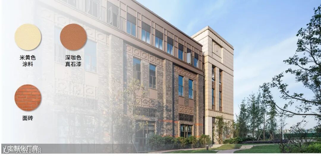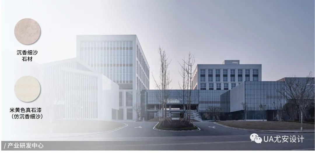 在产业园建筑的材质选用上,设计秉承经济高效的原则,按照建筑承载功能的重要性进行体系化控制:对于有展示、参观、品质体现的产业示范中心、产业研发中心、生活服务中心等功能建筑,采用铝板幕墙、石材幕墙、“铝板+真石漆”等材质。