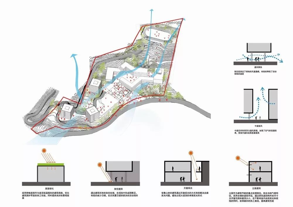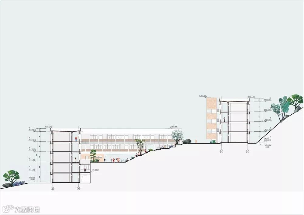 位于山中央的主楼梯广场是学生日常活动的主要区域。宿舍楼的入口、主要教学用房和室内体育馆都位于该高程附近。通过充分利用场地地形,建立多高程连接,减少了上下攀爬的需要。