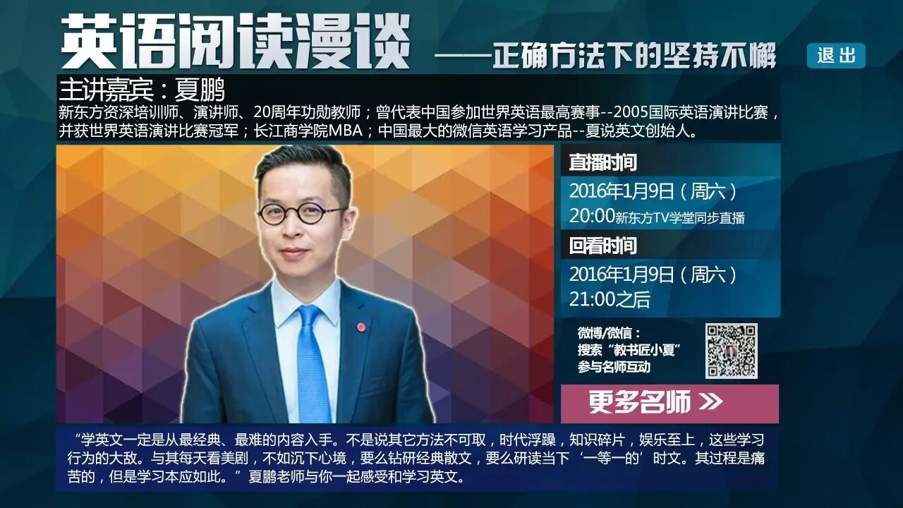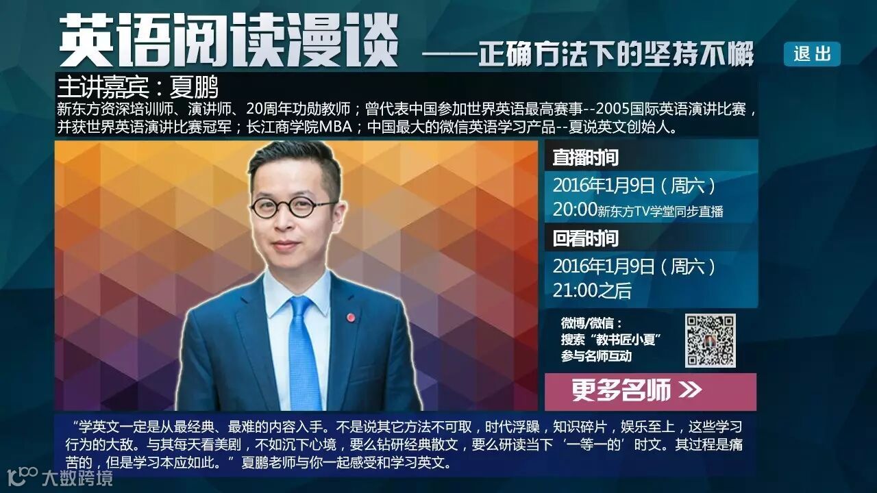 1月9日晚20:00点,东方有线独家奉送“新东方名师”夏鹏的英语阅读漫谈直播课!带您能说会看,内外兼修!