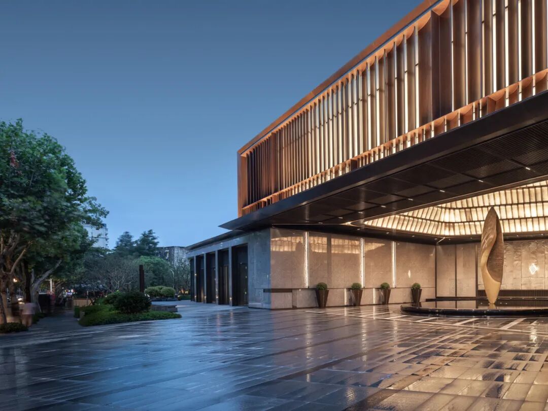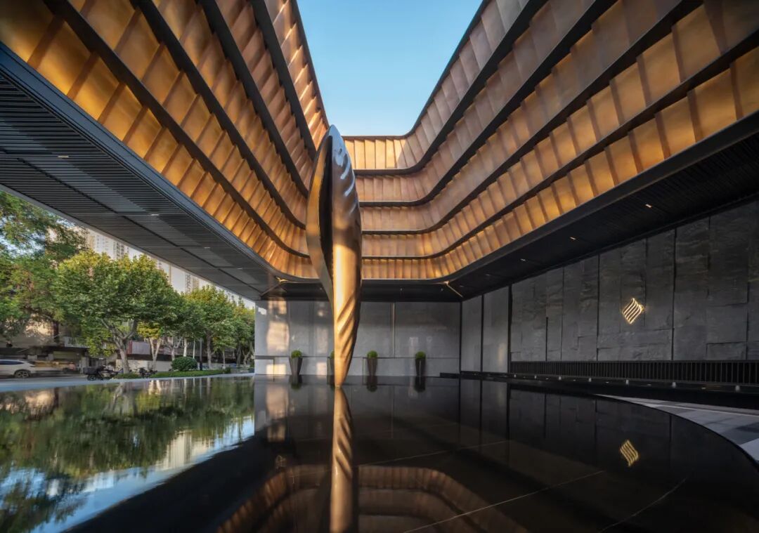外立面采用更通透、明亮的浅灰色玻璃和香槟色木纹铝板,通过细节让建筑在色泽上更温暖近人;屋面以L型折角“飞檐”封顶,中段以舒朗的水平向线条为主,裙房用海蓝宝石材的重量感加以“稳定”基座。