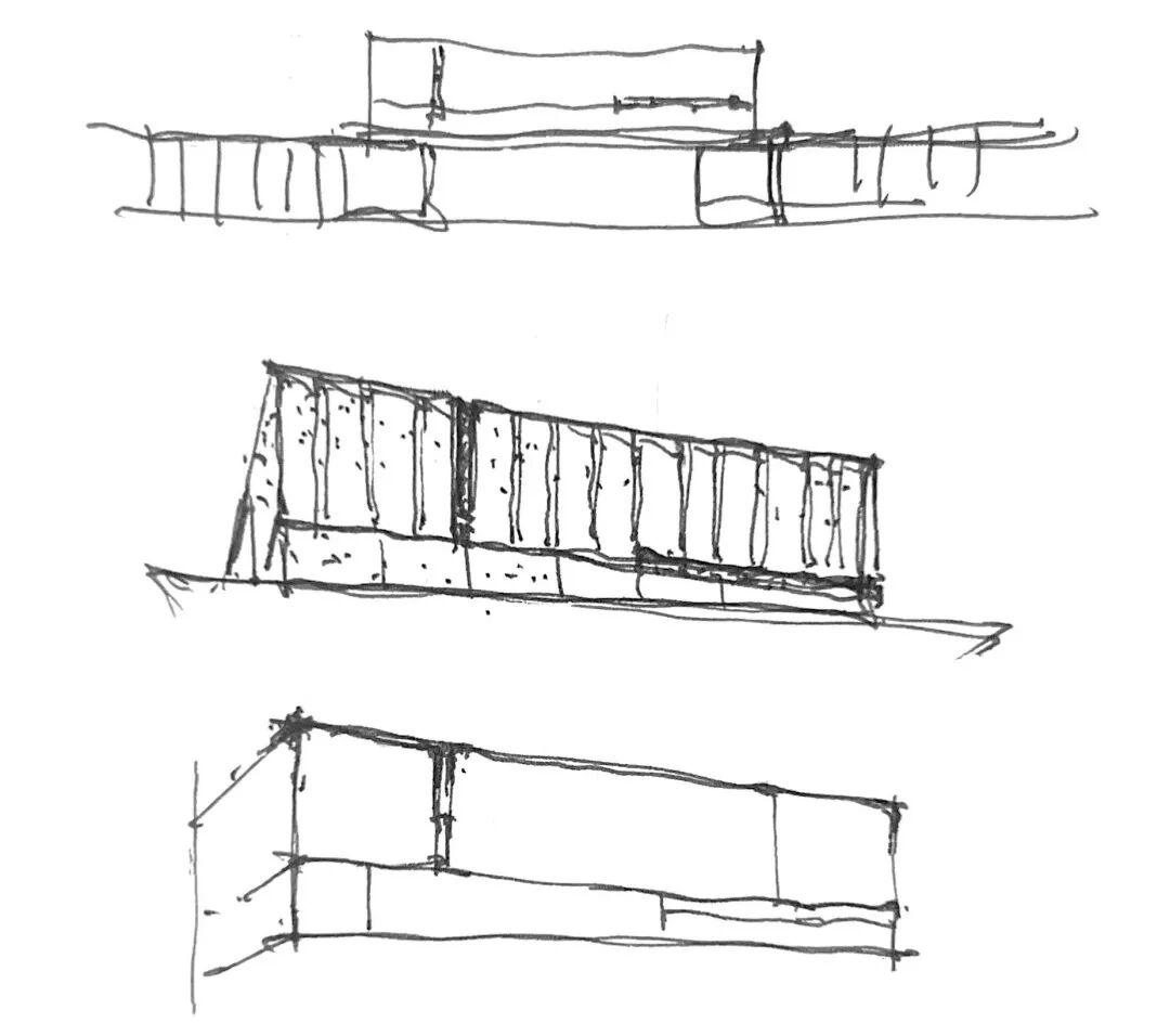建筑总高度约11米,通过严格反复推敲,上下体量在视觉上定为1:1的比例关系;整体建筑体量呈“品”字结构。