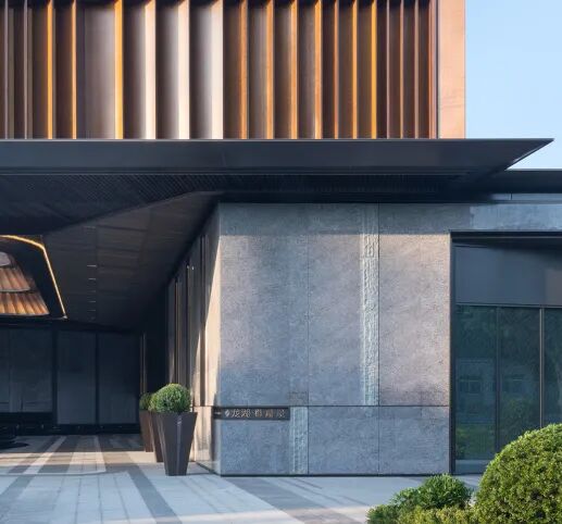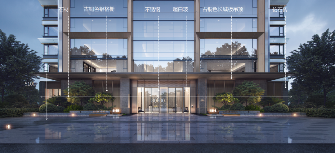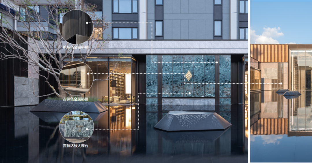 石材、金属杆件与干净利落的玻璃碰撞,产生现代、优雅的气质;近人尺度采用仿铜材料,凸显尊贵气质。
