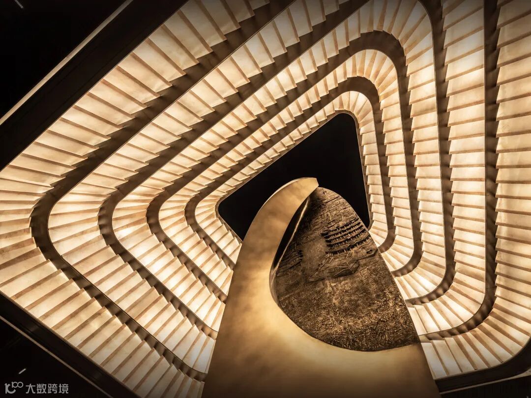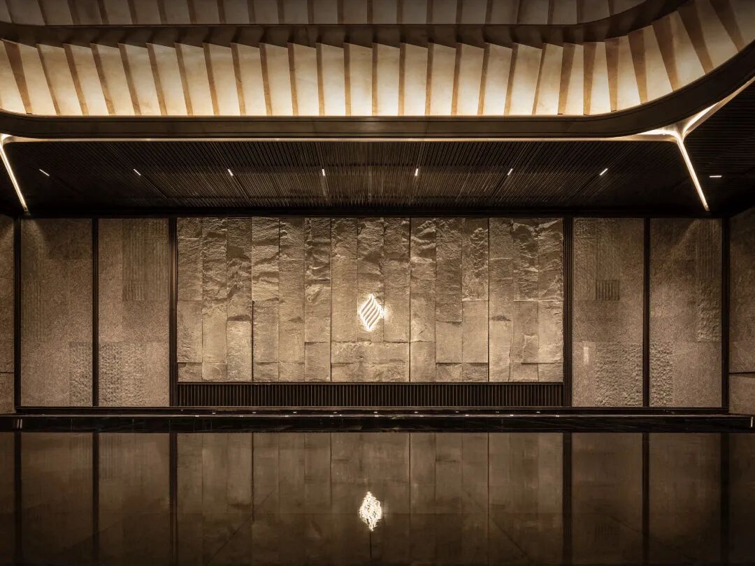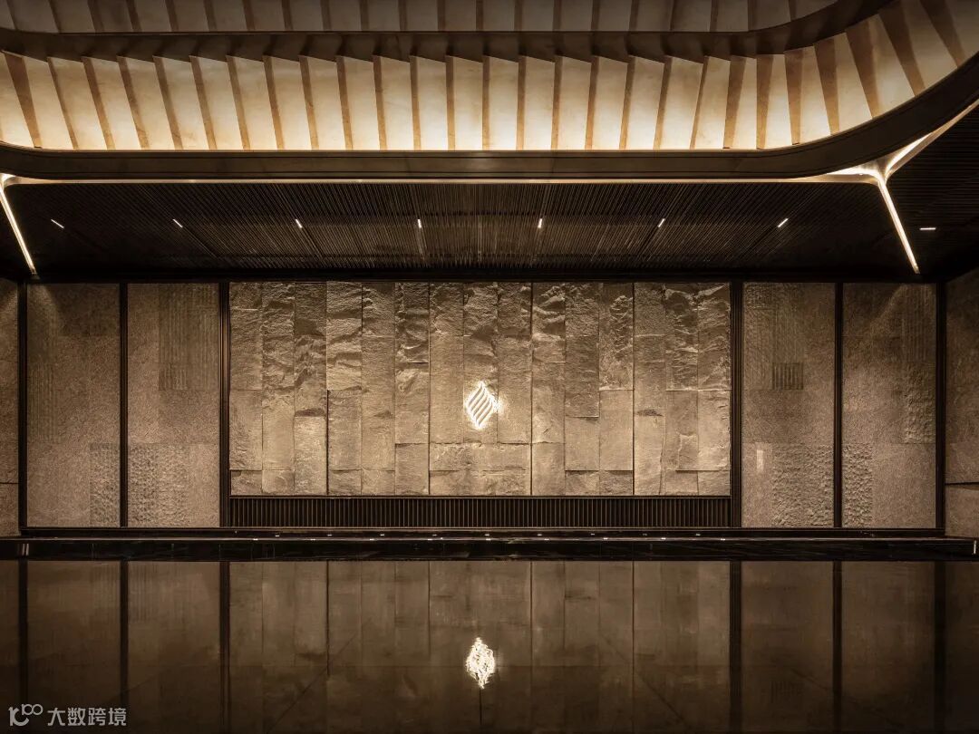 首层石材错落的斜拼方式、穹顶空间单元式云石玻璃片的参数化排布、以及二层弧形金属面板的渐变阵列,都是在统一语汇下进行的全新诠释。