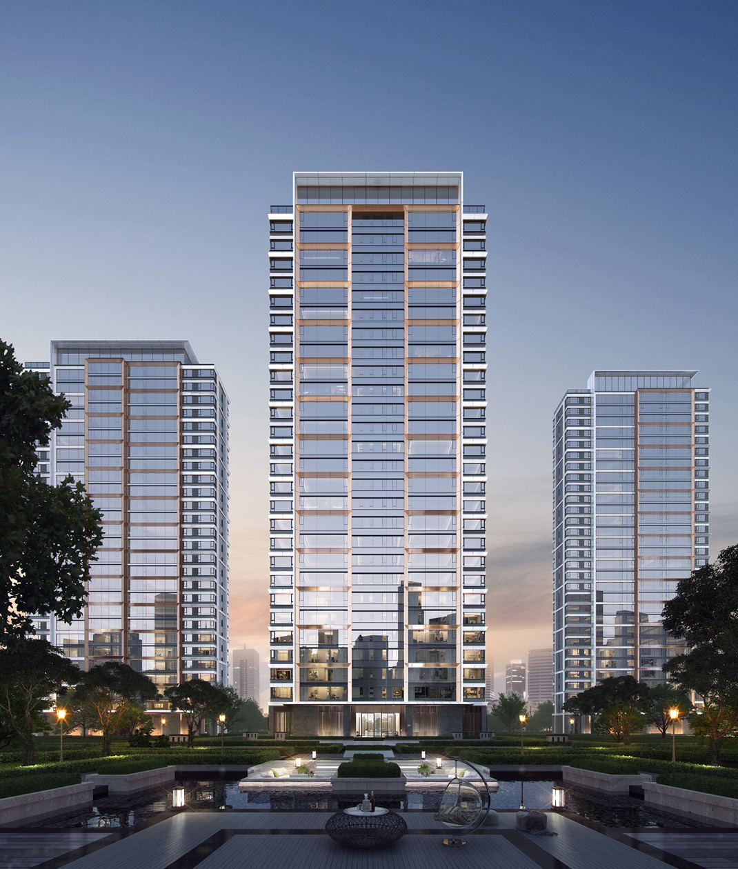 建筑采用现代风格,以简洁的形体辅以精致线条、雅致窗套、尊崇入口、入口挑檐。