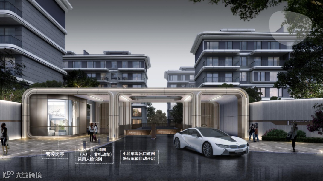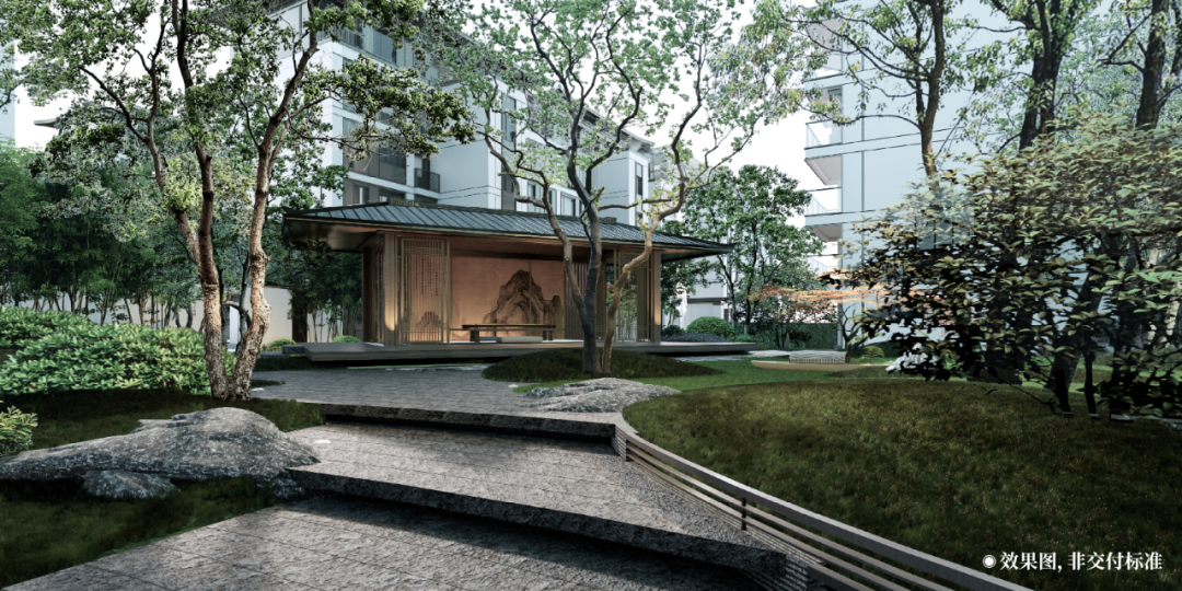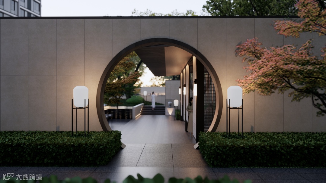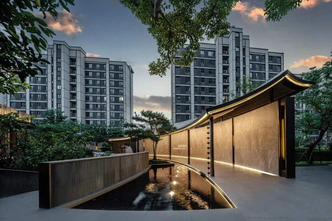 社区主入口以《桃源仙境图》意境演绎,采用平廊、水墙、亭榭等元素构建多层次现代苏韵园林景观,让归家成为一次穿越风景的旅行。