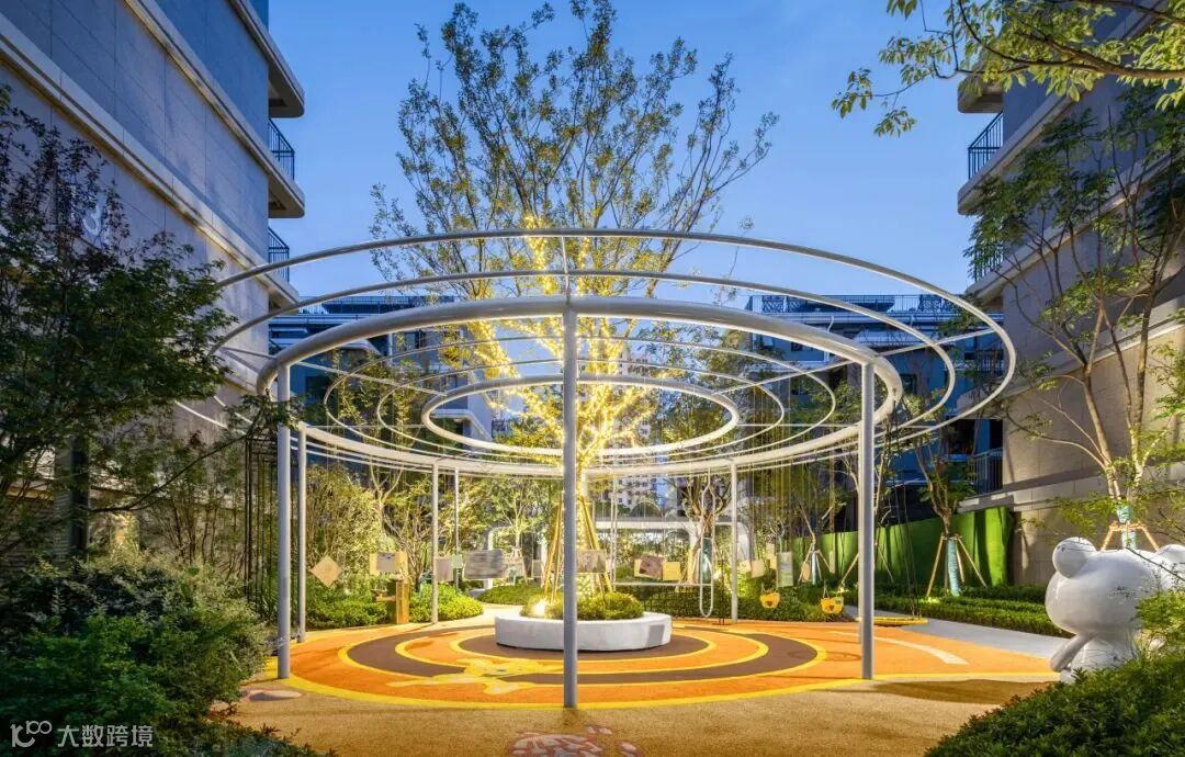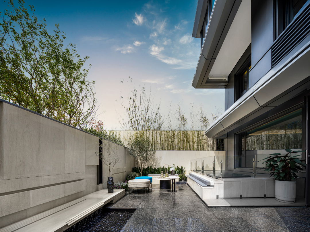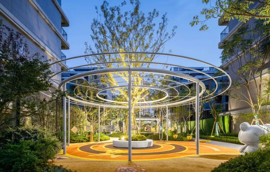 下沉庭院是最宁谧的“都会桃花源”。通过建筑L型布局围合出下沉庭院,最大程度与景观拥抱融合。造景借以起伏山丘的设计,搭配大型冬青乔木,师法自然,约5米的地势高差,构建起一条足以让业主幸福感层层递增的归家心境。