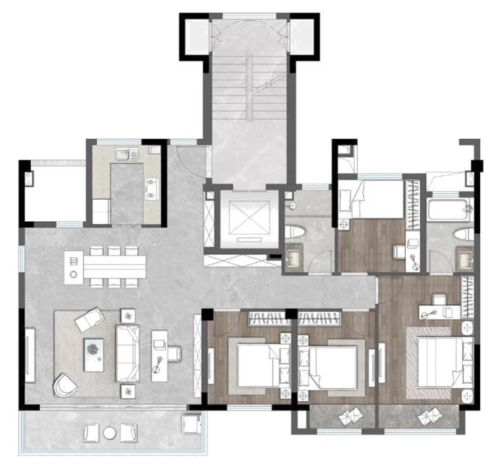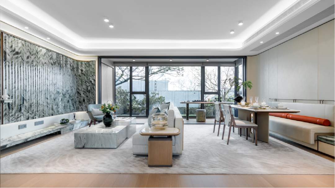 洋房极简的水平向玻璃立面清晰的展现出内部的空间结构,将132㎡、153㎡、209㎡三类户型收纳于内。展厅内设置了153㎡、209㎡两类户型的样板房,其室内设计在保证品质与观感的前提下,有效提高空间的利用率——大四房的户型设计,南北通透的整体格局,满足改善需求的同时,保留了相对独立的大套房。